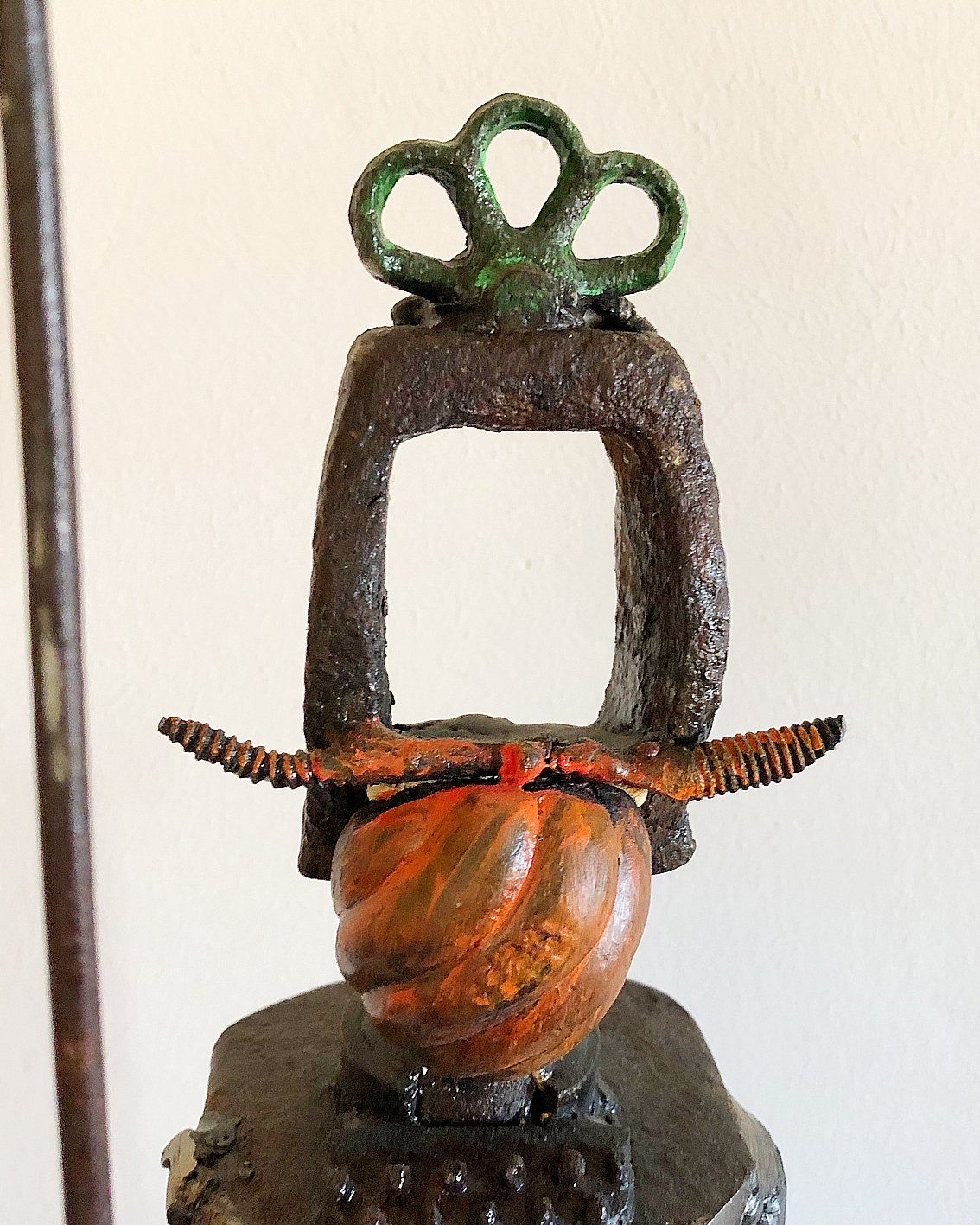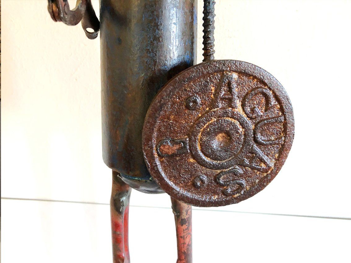 Its main characteristic is its lengthened figure, partly due to its legs, which are made of old bicycle forks.