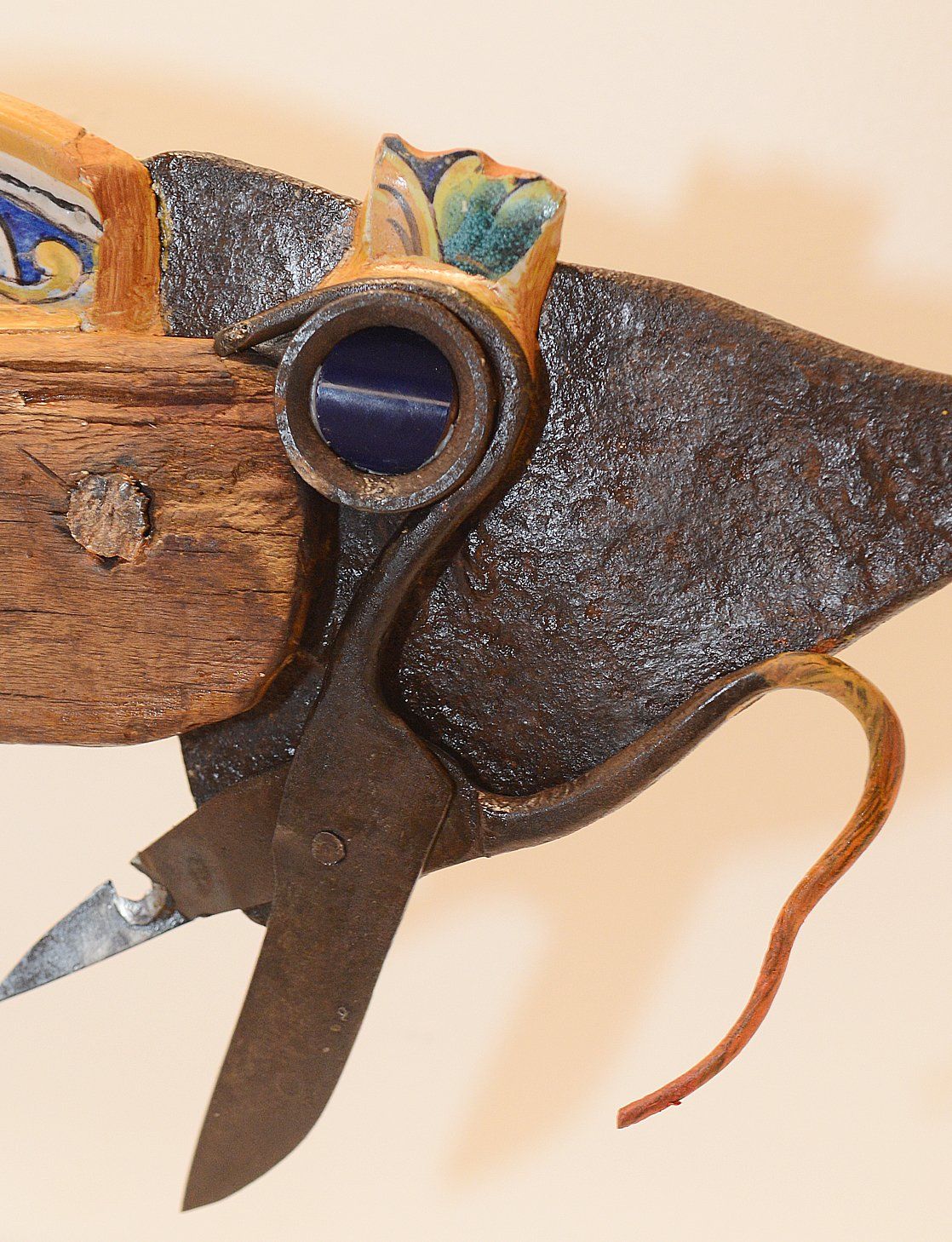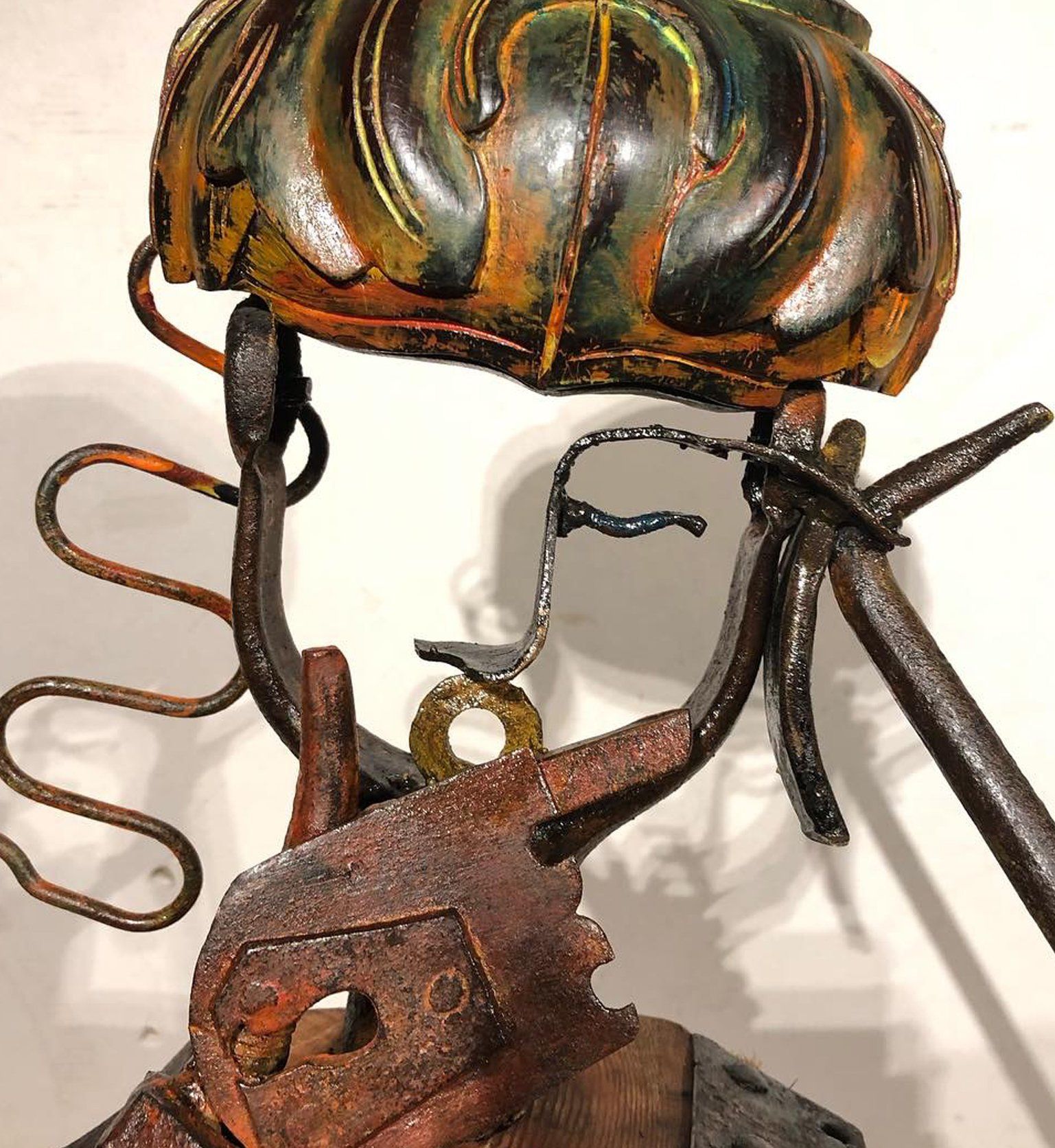 I recycle all kinds of tools. So I gather old iron, wood, stones, ceramics, strings, straps, and I weld, nail, paste, tie and paint, uniting each other to form characters like human or animal figures and other more conceptual pieces. Making art from garbage, abandoned utensils, humblest, this is the answer.